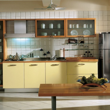 Kitchen (kitchen set) Ginco Italian manufacturer of Arrex le cucine. The model is timeless, dynamic, stylish modern design. Straight, geometric forms are complemented by "metalized" finish facades, multiple colors available: beige, white, yellow, green, the effect of beech or cherry. The glass is opaque with a pattern will add light and "airy" headset.