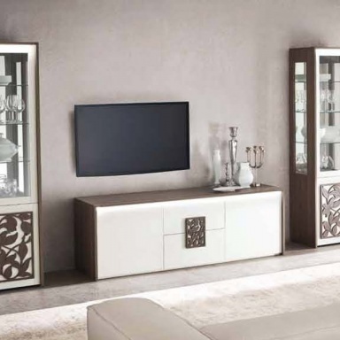 Showcase Fusion from the Italian manufacturer Maronese. The model is made in fusion style, the frame is made of wood. Showcase has glass and wood shelves and internal lights. The facade is decorated with a decorative pattern. There are options with left or right hand opening. Colors in the catalog.