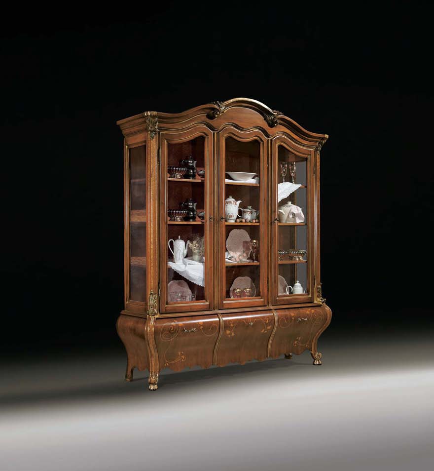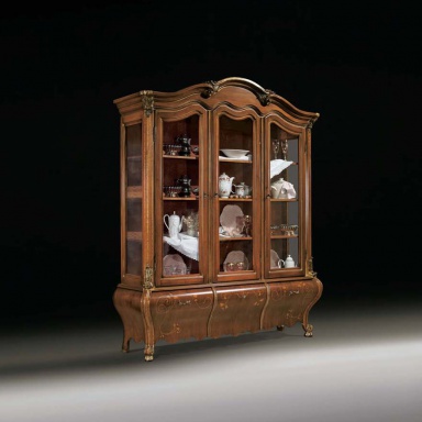 Showcase Paradise from the Italian manufacturer Arve Style. The product with 3 hinged doors made of glass, equipped with 3 drawers. The frame is made of solid wood. Finishing - veneer, selected from a catalog. The metal fittings. Skilful carving is rich in gold and inlaid handmade gives the product elegance and sophistication. Showcase is ideal for storing dishes, collection, interior. Fill the room with charm.
