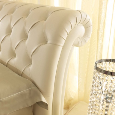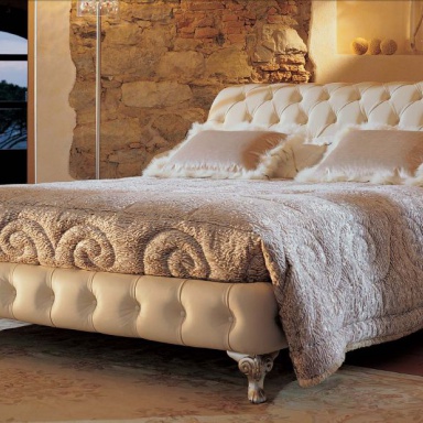 Set for bedroom George from the Italian manufacturer Tosconova. The set includes a double bed with high upholstered headboard, upholstered bedside bench. Products on a low carved legs in lacquer, decorated with stitch-Capito. Frame, base is made of solid wood. The upholstery is leather. Filler - polyurethane foam. The choice - a wide range of textures, rich palette of colors, shades.