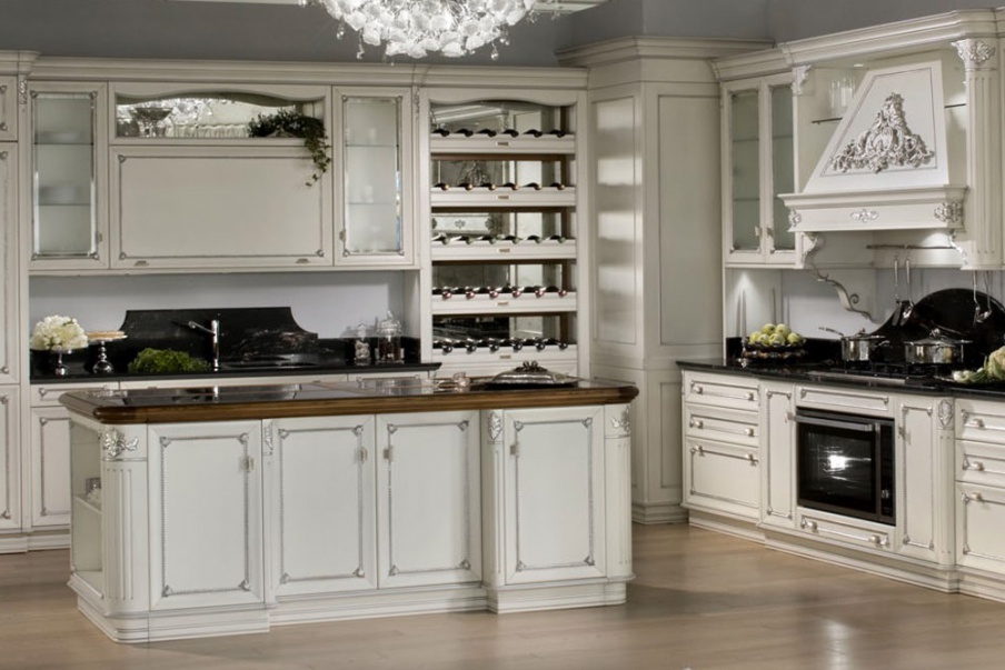 Set for the kitchen Kitchen Design from Italian manufacturer FMF. Set is made in a classic style. Ornate carvings in silver. Frame, facade, countertop - wood. The finish is the varnish from the range. Fittings of metal, in silver, styled. Provided niches for built-in appliances, a wine shelf.