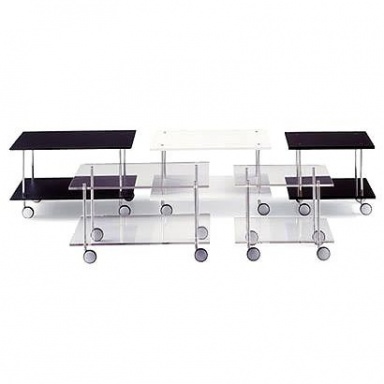 Biplano table from the Italian manufacturer Flou. The frame is made of chromed steel, top leather. Model on wheels, bedside or kitchen. A great choice for the living room or bedroom in modern style. Colors: transparent, black.