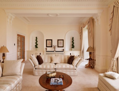 As a rule, English living room involves a large number of textiles in bright colours and natural wood in the walls and ceiling. Also it is impossible to imagine the interior living room in English style without a fireplace and a sweeping staircase. Ceilings are decorated with stucco and the floors are made of parquet.