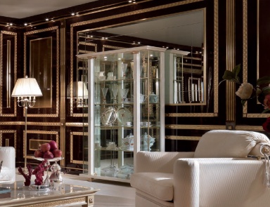 Sofas are upholstered in luxurious textiles, plain or with ornaments. Armrests with wooden detail smoothly bent, and the back rests on a decorative cushion. The model is decorated with rope piping and tassels. Finish – gloss polyester, color "ochre" with the effect tamponato. Showcase white color is made of solid wood and engraved glass. The back wall is mirrored. Available with halogen lighting. The Berry collection will help you create the living room of your dreams!