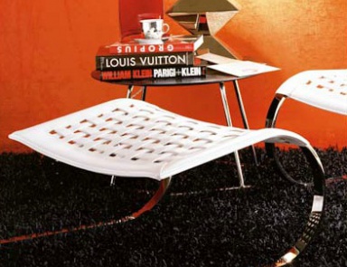 Brevity, elegance stands out in the model Tender pouf. High frame with cross base is made of chromed metal. For upholstery, use great skin. To this model you can also buy a chair of similar design.