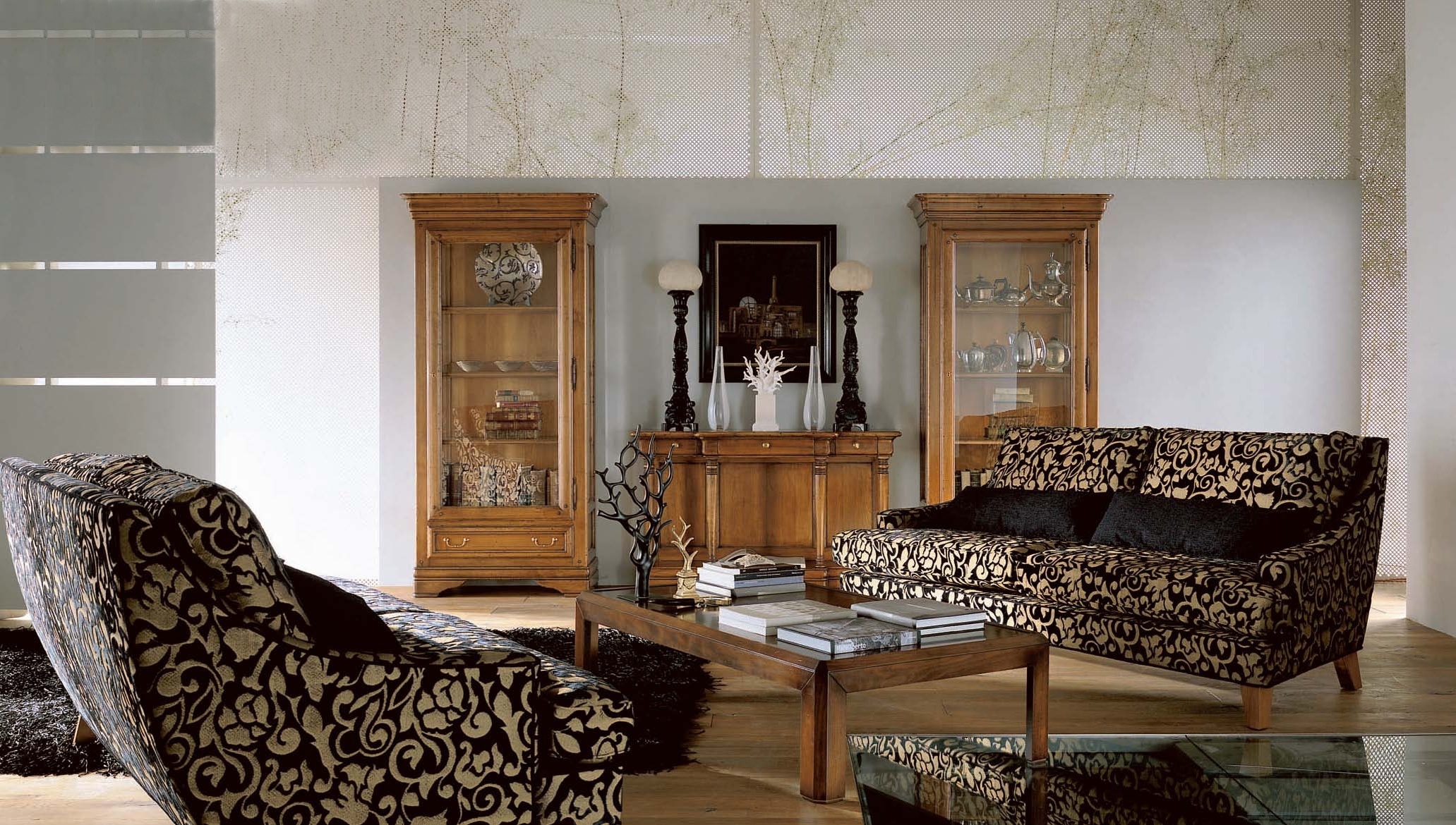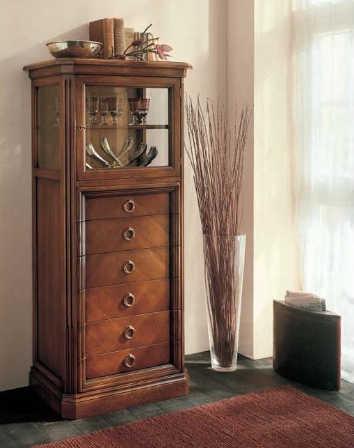 Showcase with drawers, Selva. In the basis frame made of natural wood. The facade and sides are made of glass. Handles are metal. The casing is lacquered. Colors according catalogue. The best choice for living room classic style.