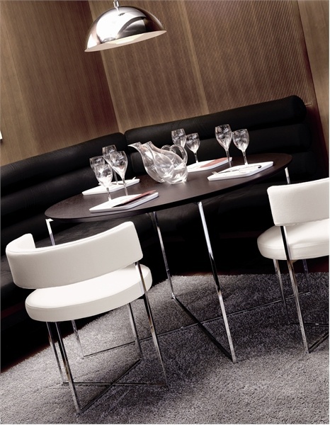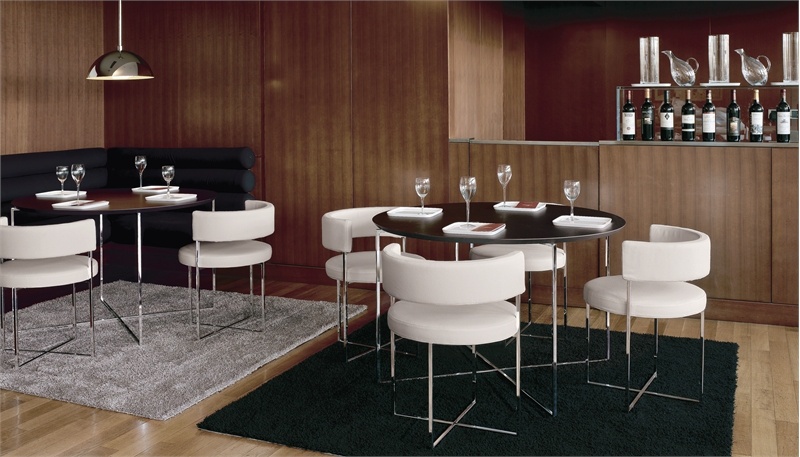 | Description: | Dining table round shape. The base is made from chromed metal. Countertop covered with black glossy varnish. |