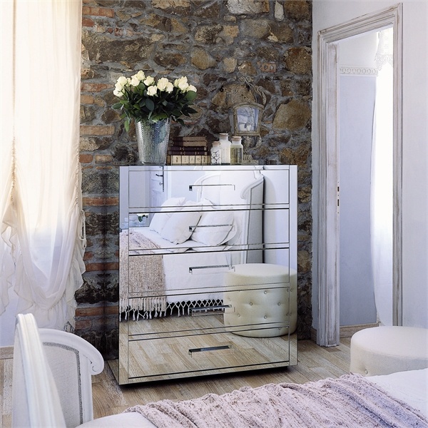 The Queen chest of drawers from Italian manufacturer Porado. The body is made of solid wood, the facade is made of mirror glass. This model has a chest of drawers to accommodate personal items. This solution models a mirrored chest can be replaced and the mirror.