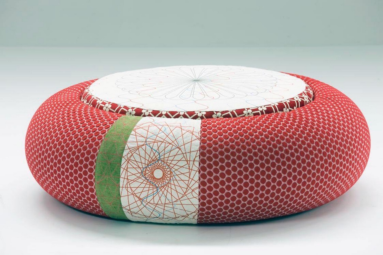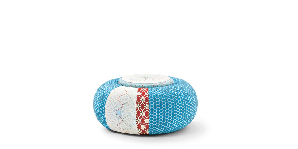 The Donut stool from the Italian manufacturer Moroso. The model is made on a frame of wood filled with polyurethane foam of varying stiffness and polyester fiber. Pouf covered in fabric from the collection of Sushi, specially created for this model. A distinctive feature of the collection are the embroidered designs, floral ornaments, geometric shapes. Factory offers two sizes of poufs. A great addition to your interior.