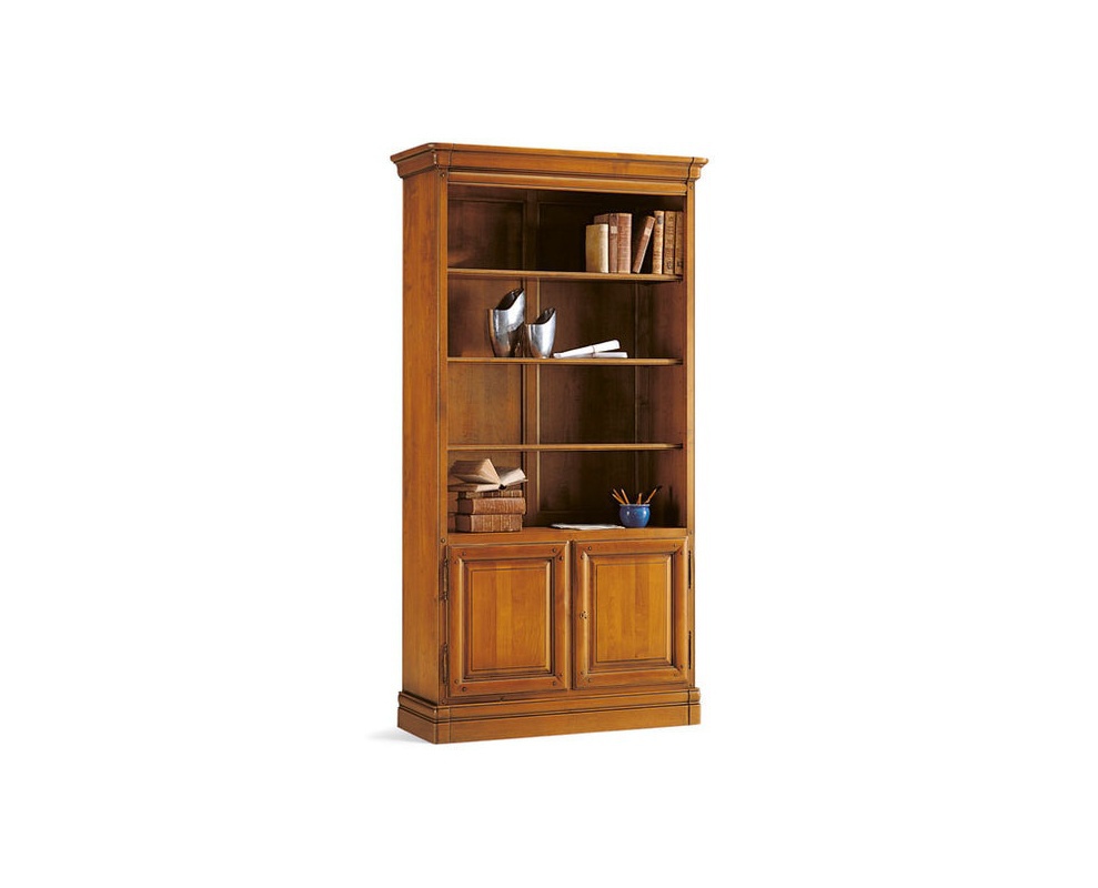 The bookcase from the Italian manufacturer Selva. Model with open shelves at the top. Provided below the sliding doors, lockable with a key. Lacquered Cabinet made of cherry tree. A great addition to a living room in classic style.
