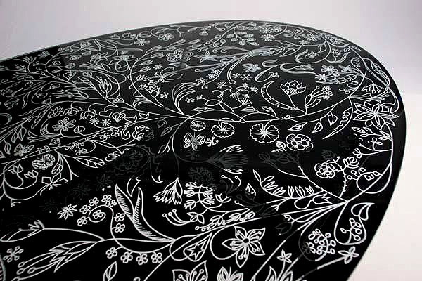 Table Tord Boontje Collection from the Italian manufacturer Moroso. The table from the designer of buntje Tord (Tord Boontje). Steel frame powder painted in Matt white and glossy black. Options: table-top from an artificial stone Corian white, patterned and tempered black glass with a pattern. The collection also includes sofas, armchairs, rocking chairs, chairs in leather and textile upholstery, beds, mirrors from tempered glass with a white printed textile floral decoration. The table in contemporary style will complement your living room or dining room.