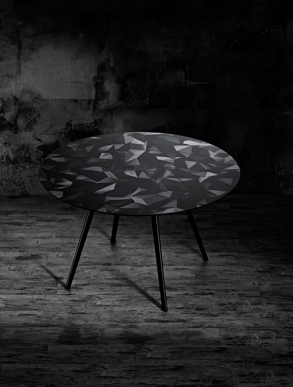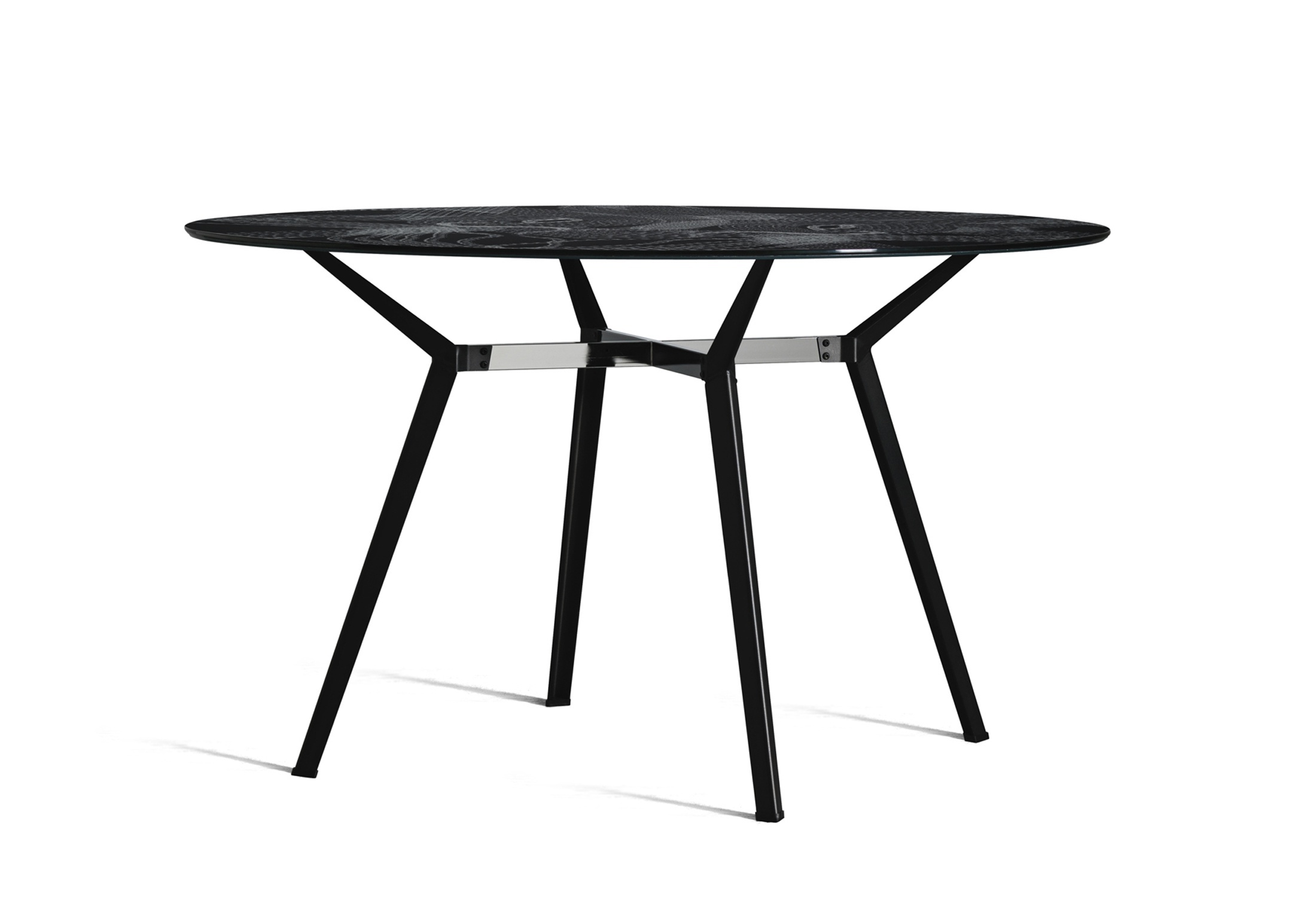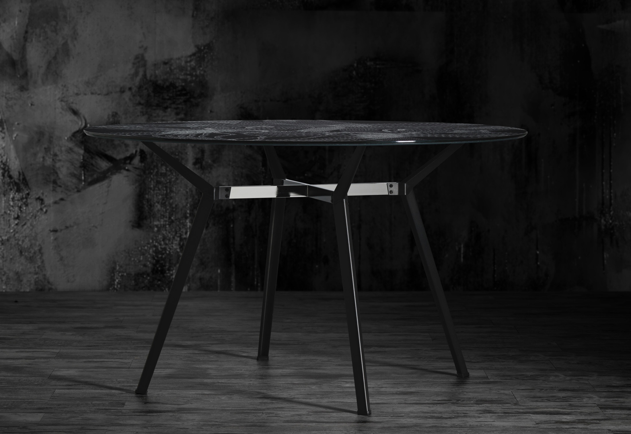 Table Pylon Prismic from the Italian manufacturer Moroso. Table with metal frame in black or chrome-plated steel. The shape of the frame resembles the supports of high voltage lines, with the English translated title of the Pylon. The table top is made of glass and decorated with images of chains or prisms. The design was developed in cooperation with Diesel. A table will adorn your interior in contemporary style.