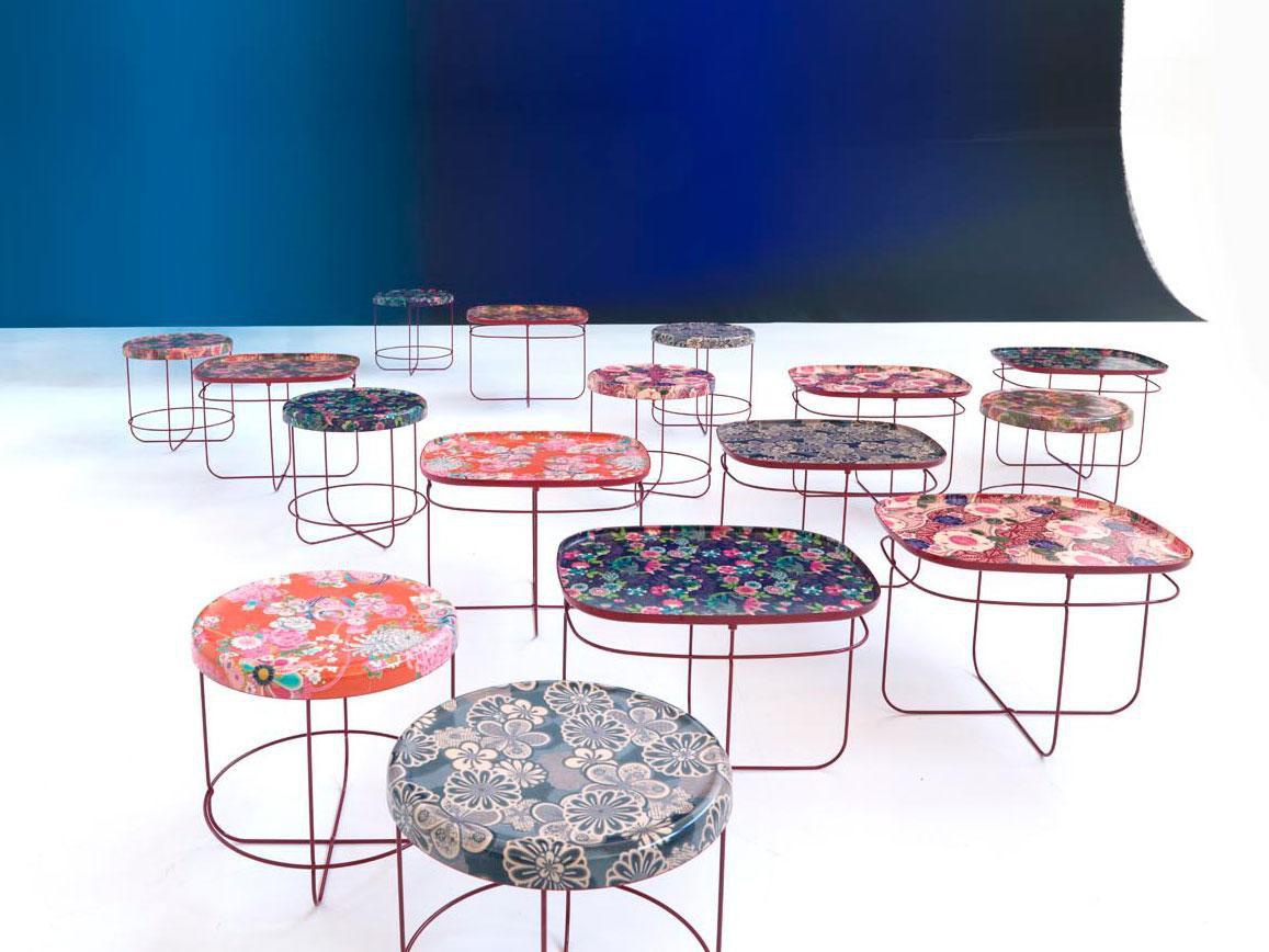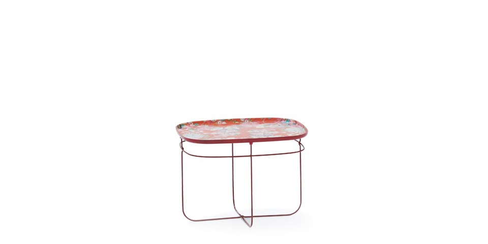 The Ukiyo table from the Italian manufacturer Moroso. Low table on a steel frame, painted in red. Table top with decorative floral pattern, the top filled with a transparent polyester resin. Decor options to choose from the catalog of the manufacturer. Table will be a decoration for your living room in modern style.
