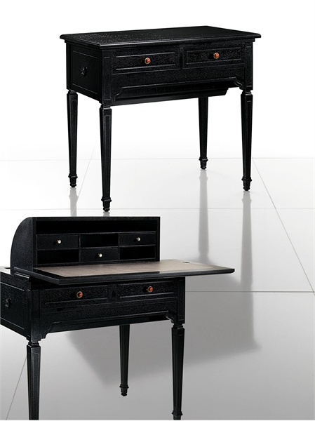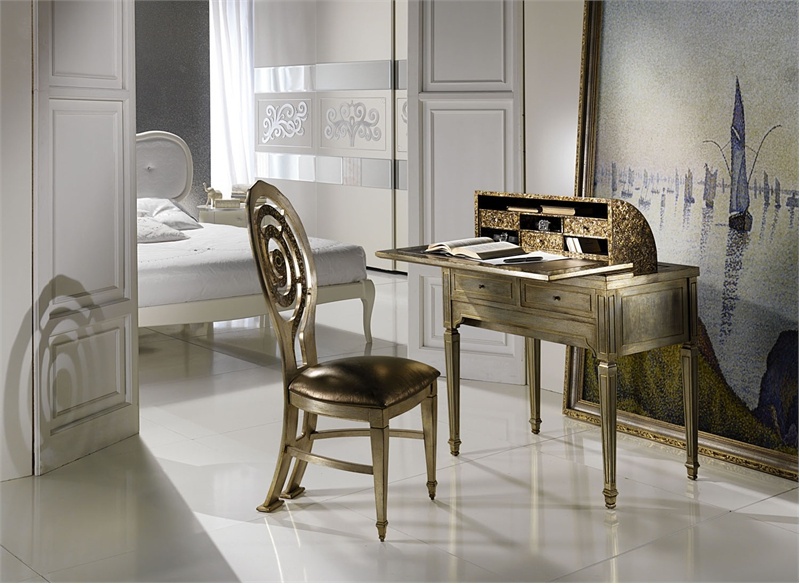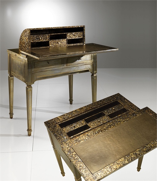 | Description: | The elegant table, which, if necessary, thanks to a special patented mechanism can turn into a practical table, and can also be used as a dressing table for the bedroom. The structure of wood, finish F05 - from the outside in silver with patina and finishing the interior of the "Macchiaioli" - gold leaf and silver leaf embossed in black. The countertop in the skin. |