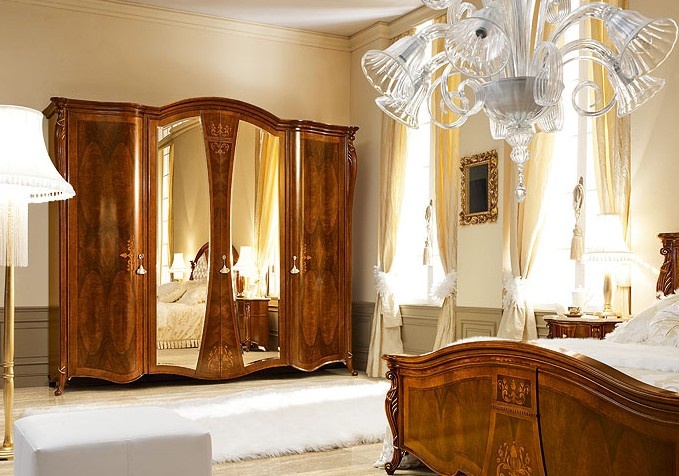 Furniture set for bedroom in classical style (Signorini & Coco). Consists of wardrobe, double bed with wooden headboard / headboard, partially covered textiles; Bureau with flap (top finish veneer or marble); bedside tables; wall mirrors; vanity mirror; pouf; cabinets for TV. Massive furniture made of natural wood embellished with hand-carved. Forged by the classic hardware technologies emphasizes the furniture belonging to that period.