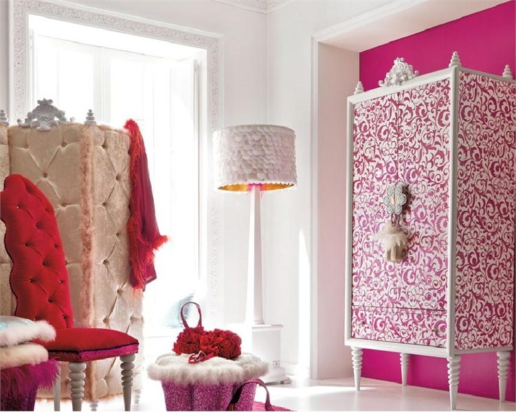 Wardrobe for kids room from Italian proizvodite AltaModa. Frame products vypolnen from solid wood. The surface is decorated with handmade paintings. Used colors are white and pink.