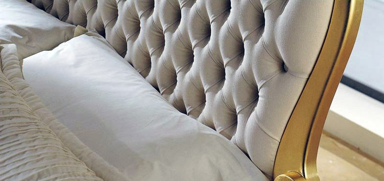 Double bed Hermes Basso from the Italian manufacturer Cantori. Model of the collection of Chic Atmosphere in a modern style. Frame a headboard from a solid wood with carved elements, decoration in gold and silver. Soft padding is adorned carriage padding, filler - polyurethane foam. Legs carved from solid wood. Support the sidewalls of a metal frame and wooden slats. Colours in stock.