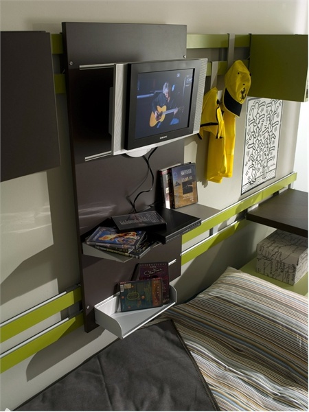 Kit for teen room, CIA International. Set consists of a modular storage system, bed and work space. Furniture made of natural materials, oak wood. Colors according catalogue.