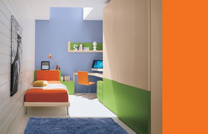 Set for children's C9 by Italian producer Julia Arredamenti. Includes wardrobe, single bed,Desk, chair and shelf. Material - wood and metal. The varnish finish offered. Colors in the catalog of the company.