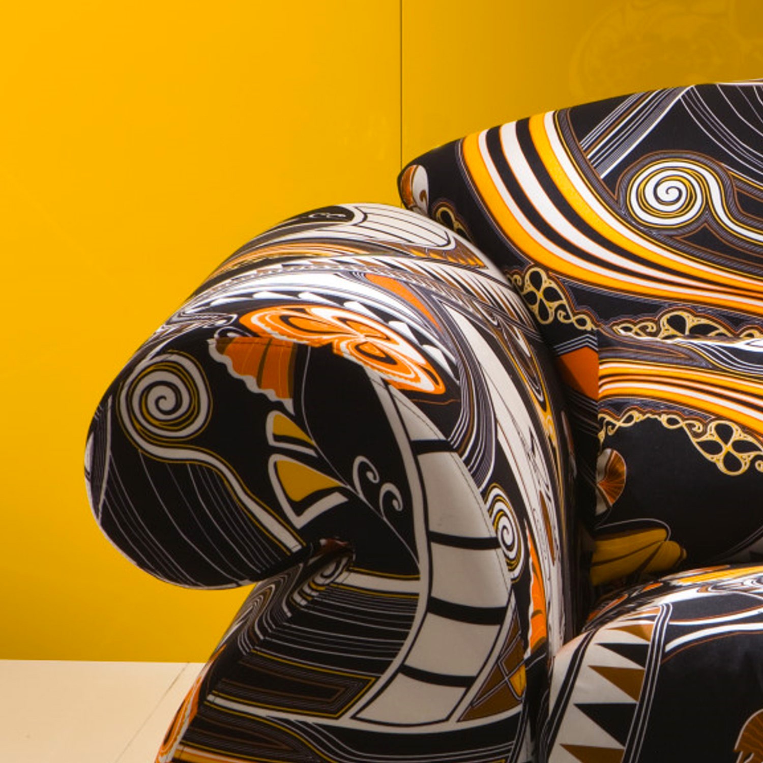 The Regina di Cuori armchair from Italian manufacturer Moda. Furniture on wooden frame fully upholstered textile fabric. The armrests are decorative, curved shape. Practical removable pillow. Style furniture glamour. Upholstery design decorated with a colored pattern. Possible color variations in the catalog of the manufacturer.