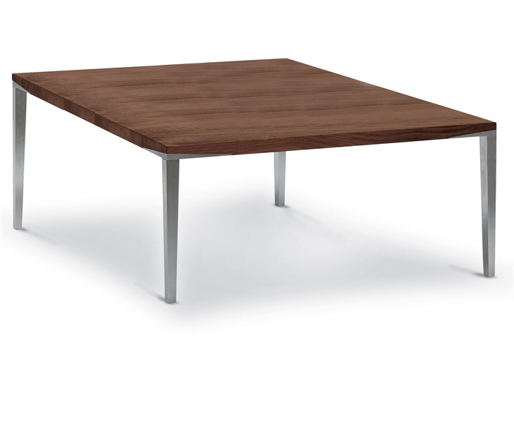 Table Alfredo, coffee. The model is a square or rectangular shape. The base is made from aluminum. The top is made of solid wood. The style is modern. Colors according catalogue.