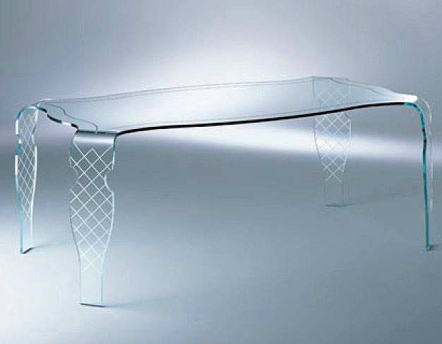 Irony dining table from the Italian manufacturer Fiam. The model of one-piece curved glass. Legs and perimeter of table top are decorated with sandblasted. Model rectangular will certainly decorate dining room in modern style. Product color transparent.