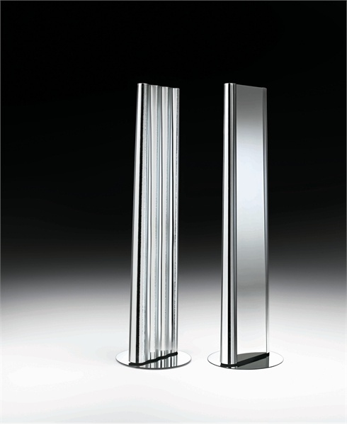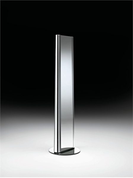Mirror Mir from the Italian manufacturer Fiam. Model mounted on the rotary carrier. Round base and internal frame made of lacquered steel, the base is covered in mirror glass. Bent the frame is also made of glass. Product outdoor rectangular shape is designed for bedroom in designer style. Color: steel, silver.