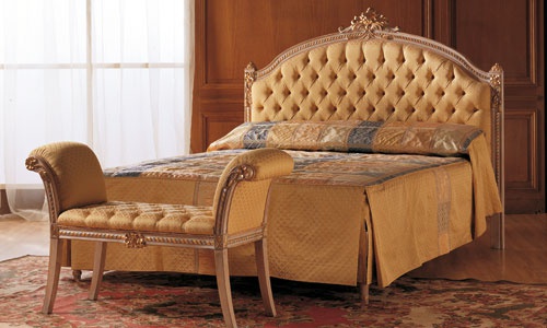 CANALETTO bed from the manufacturer Galimberti Mario. The frame is made from solid wood. The model without the foot rests on high legs. High textile headboard framed by decorative columns profusely decorated with carving and stitch. A great choice for bedrooms in classic style. Colors: light natural wood color.