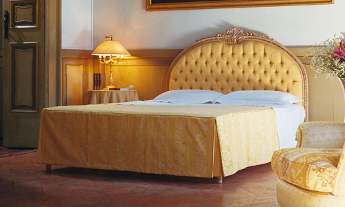 Bed GIORGIONE from the manufacturer Galimberti Mario. The frame is made from solid wood to fabric from a range of campaigns. High and padded headboard adorned with decorative stitch. Frame headboard carved. Double model is intended for bedrooms in classic style. Colors: light natural wood color.
