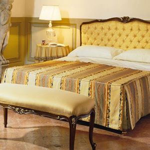 Bed RENOIR by the manufacturer Galimberti Mario. The frame is made from solid wood. Headboard adorned with decorative carvings, textile insert with stitch and buttons. The model can be supplemented by a bench of similar design. Double bed designed for bedroom in classical style. Colors: Golden, natural color of the wood.