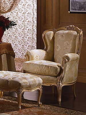 The RENOIR armchair from the manufacturer Galimberti Mario. The frame is made from solid wood to fabric from a range of campaigns. Model with side"ears" that extend into the arms-curls. Curved legs in the form of animal paws and visible parts of the frame profusely decorated with carvings or gilding. The chair can be supplemented by a stool of similar design. A chic choice for the bedroom in classic style. Color range: light, Golden.