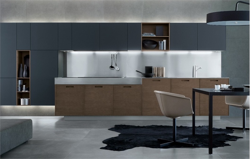 Kyton kitchen by Italian manufacturer Varenna. Kitchen in a modern style. The frame is made from solid wood, finish options: lacquer, walnut veneer, oak wenge. Available with a facade of frosted glass. The table top is made of stainless steel. Colours in stock.