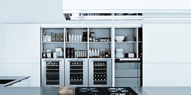 Kitchen Matrix Varenna Italian manufacturer. Kitchen in a modern style. The frame is made from solid wood, finish options: gloss or Matt lacquer, walnut veneer, oak wenge. A distinctive feature of the kitchen is the open shelves. Available with a facade of frosted glass. Countertop made of natural stone . Colours in stock.