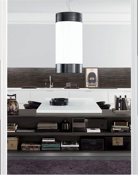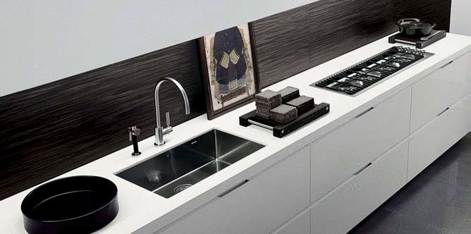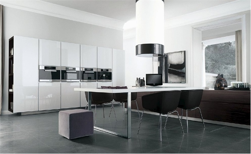 Kitchen Matrix Varenna Italian manufacturer. Kitchen in a modern style. The frame is made from solid wood, finish options: gloss or Matt lacquer, walnut veneer, oak wenge. A distinctive feature of the kitchen is the open shelves. Available with a facade of frosted glass. Working area made of natural stone. Colours in stock.