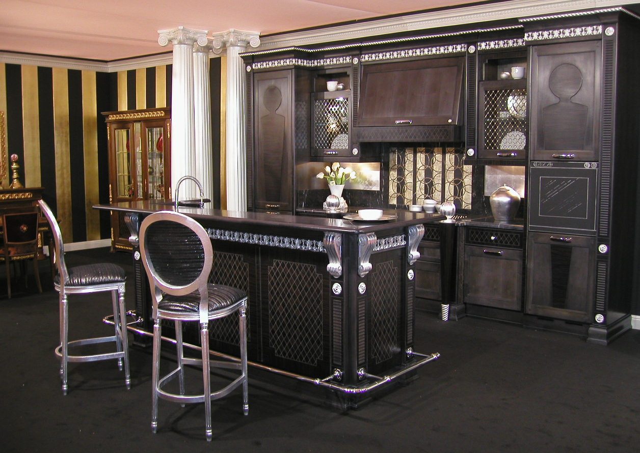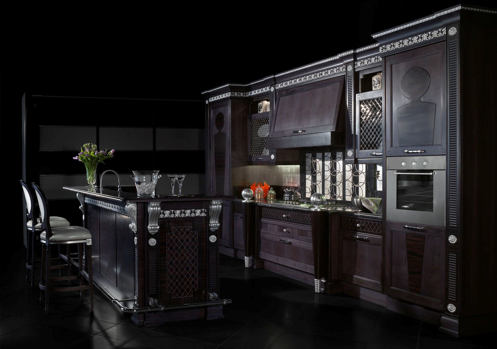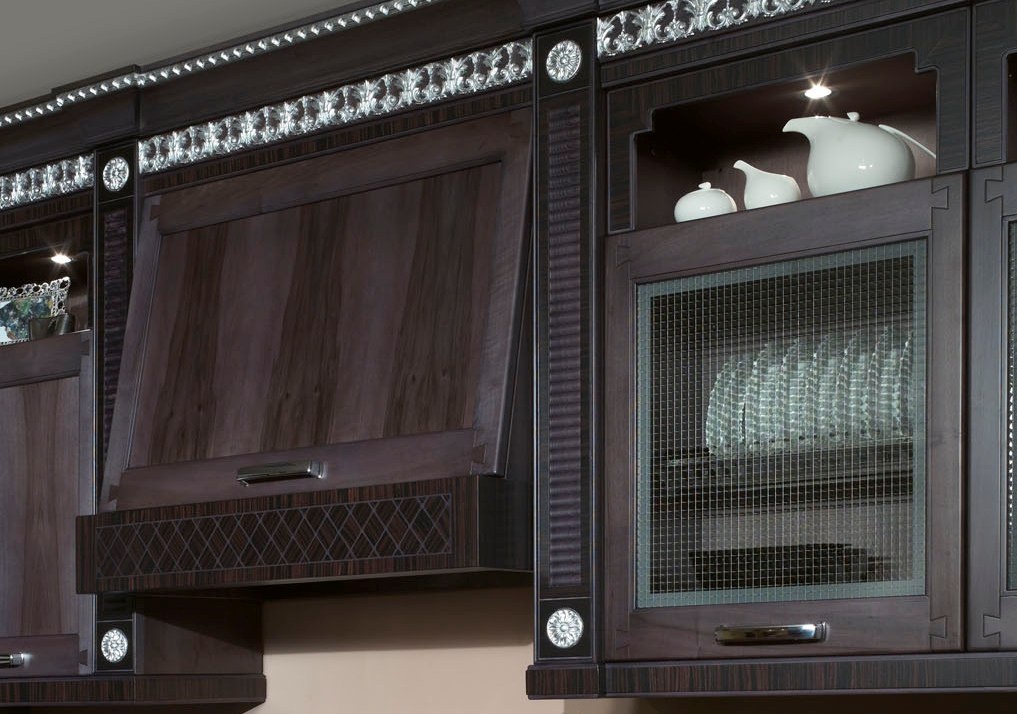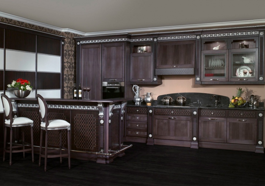 Kitchen with island MAJESTIC SILVER Corp MAJESTIC collection from the Italian manufacturer Arca. Kitchen set built in an eclectic neo-Renaissance. Characterized by the revival of ancient forms, combined with rich carving, ornament, and decoration in gold. For furniture used walnut wood and other softer woods.