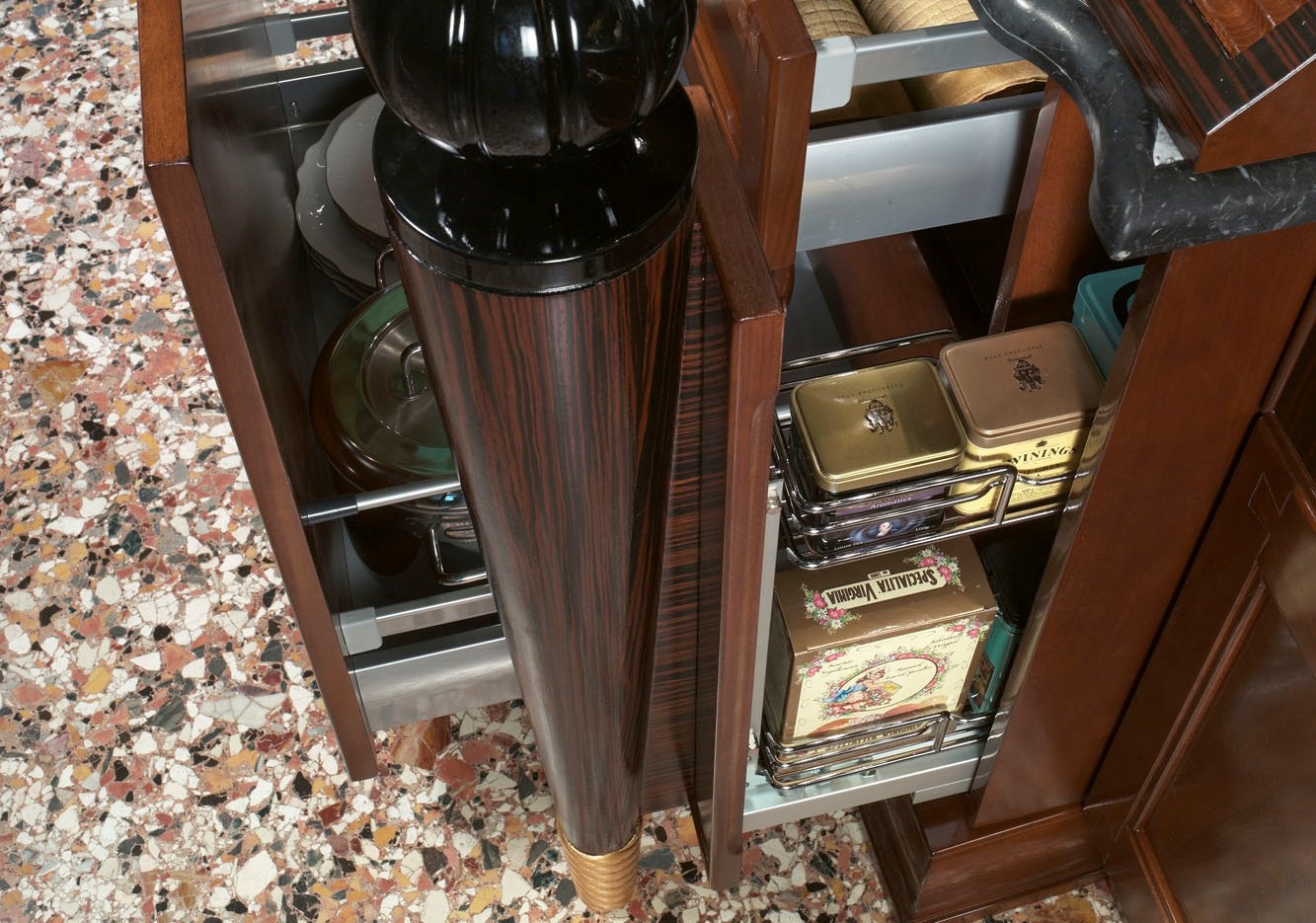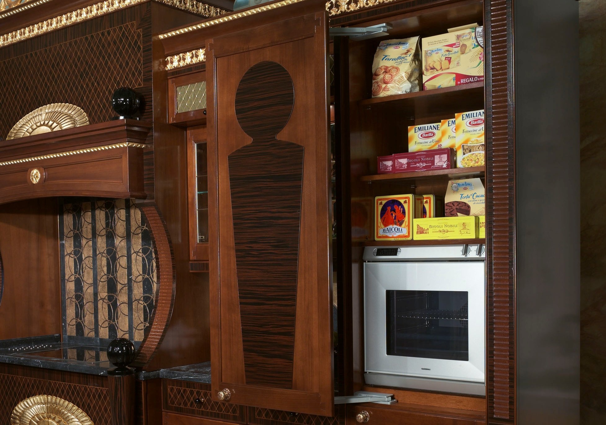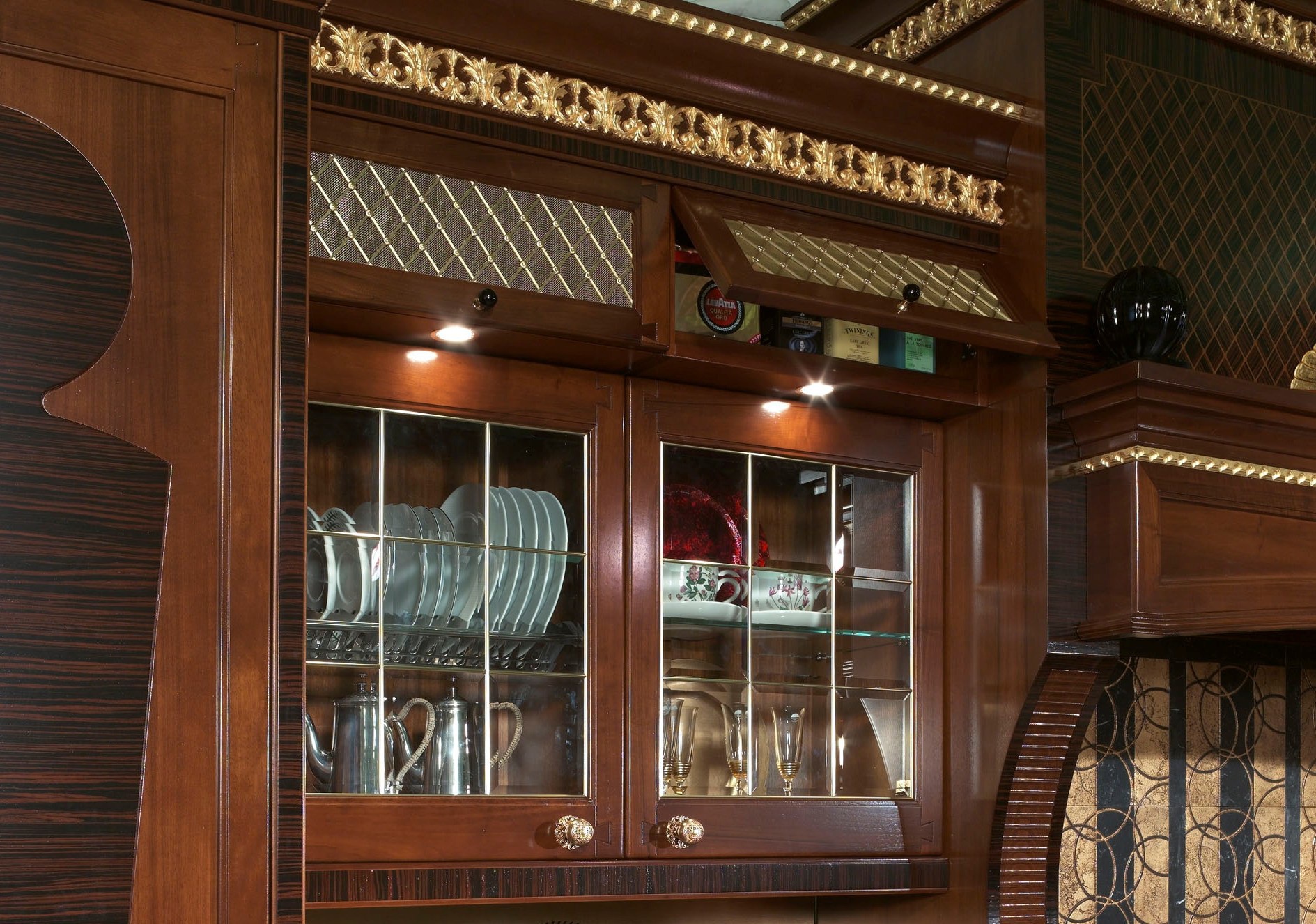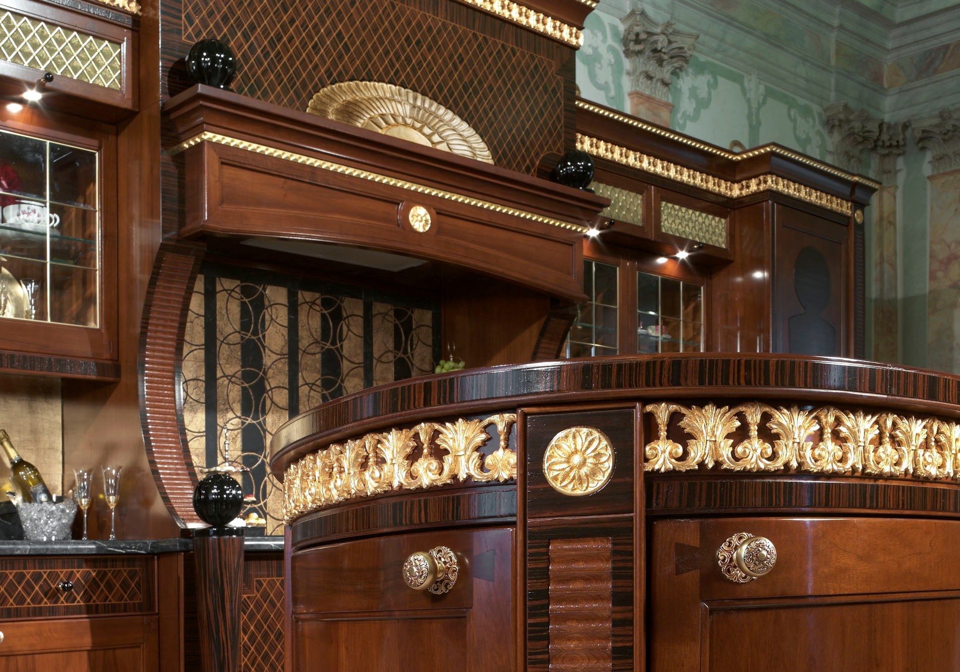 Kitchen with island MAJESTIC Gold MAJESTIC collection from the Italian manufacturer Arca. Kitchen set built in an eclectic neo-Renaissance. Characterized by the revival of ancient forms, combined with rich carving, ornament, and decoration in gold. For furniture used walnut wood and other softer woods.