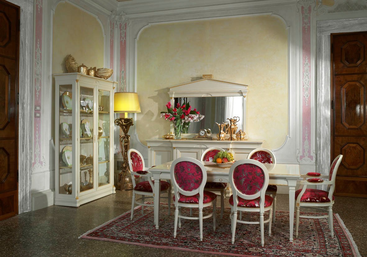 For Mobili dining room set from the Italian manufacturer Arca. Set includes depleted table, chairs, buffet, showcase. Furniture built in an eclectic neo-Renaissance. Characterized by the revival of ancient forms, combined with rich carving, ornament, and decoration in gold. For furniture used walnut wood and other softer woods.