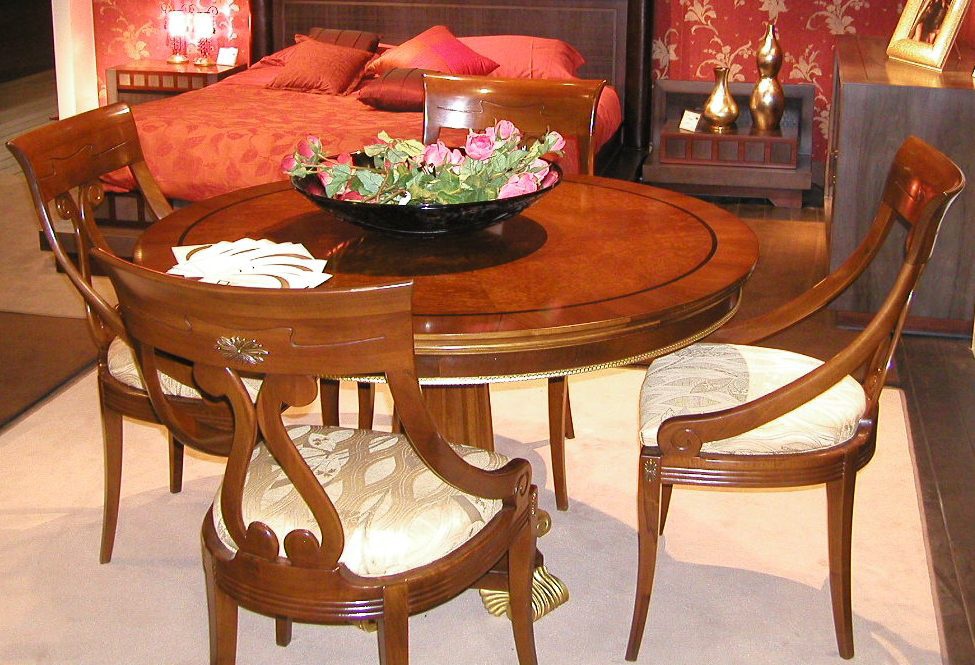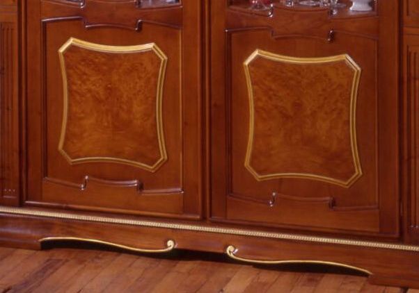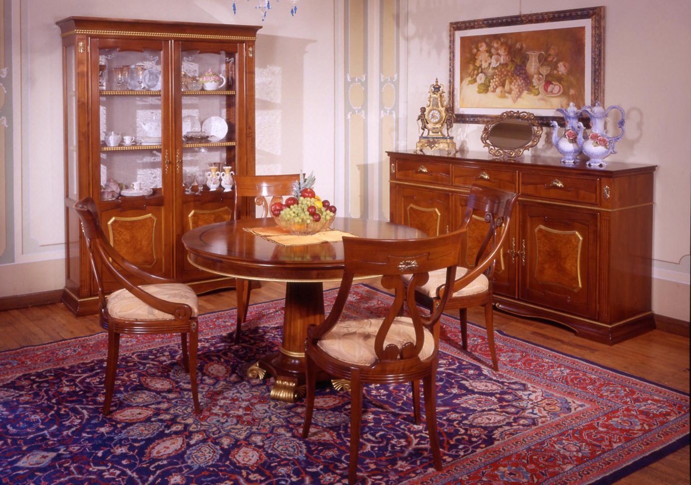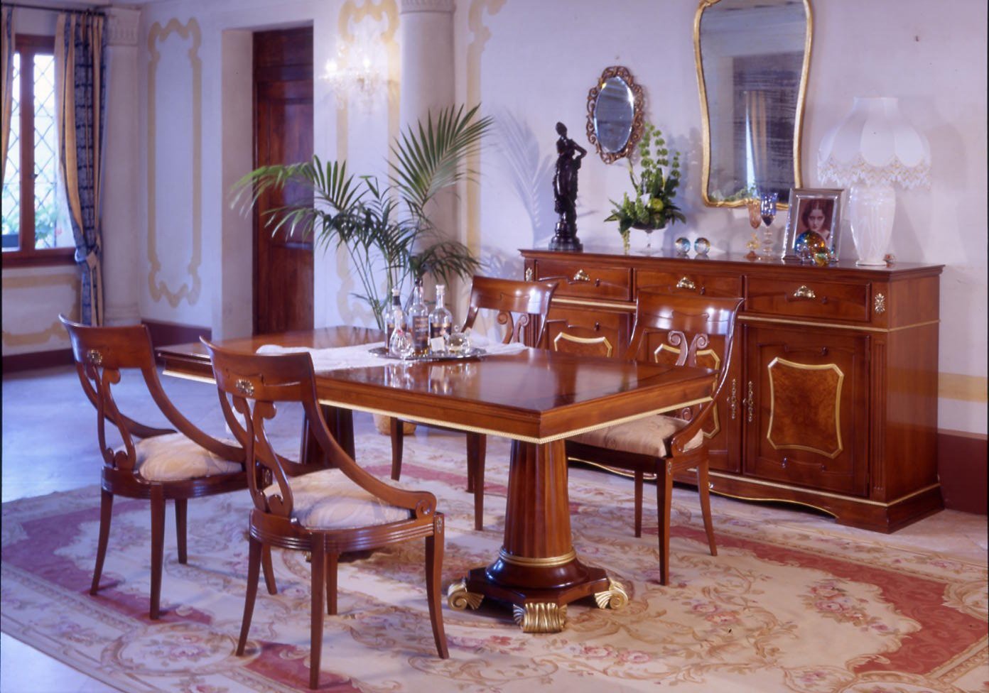 Set to Premiere Mobili dining room from Italian manufacturer Arca. Stylish and elegant set, includes depleted table, chairs, buffet, chest of drawers. For furniture used walnut wood and other softer woods. The furniture is characterized by the revival of ancient forms, combined with rich carving, ornament, and decoration in gold.