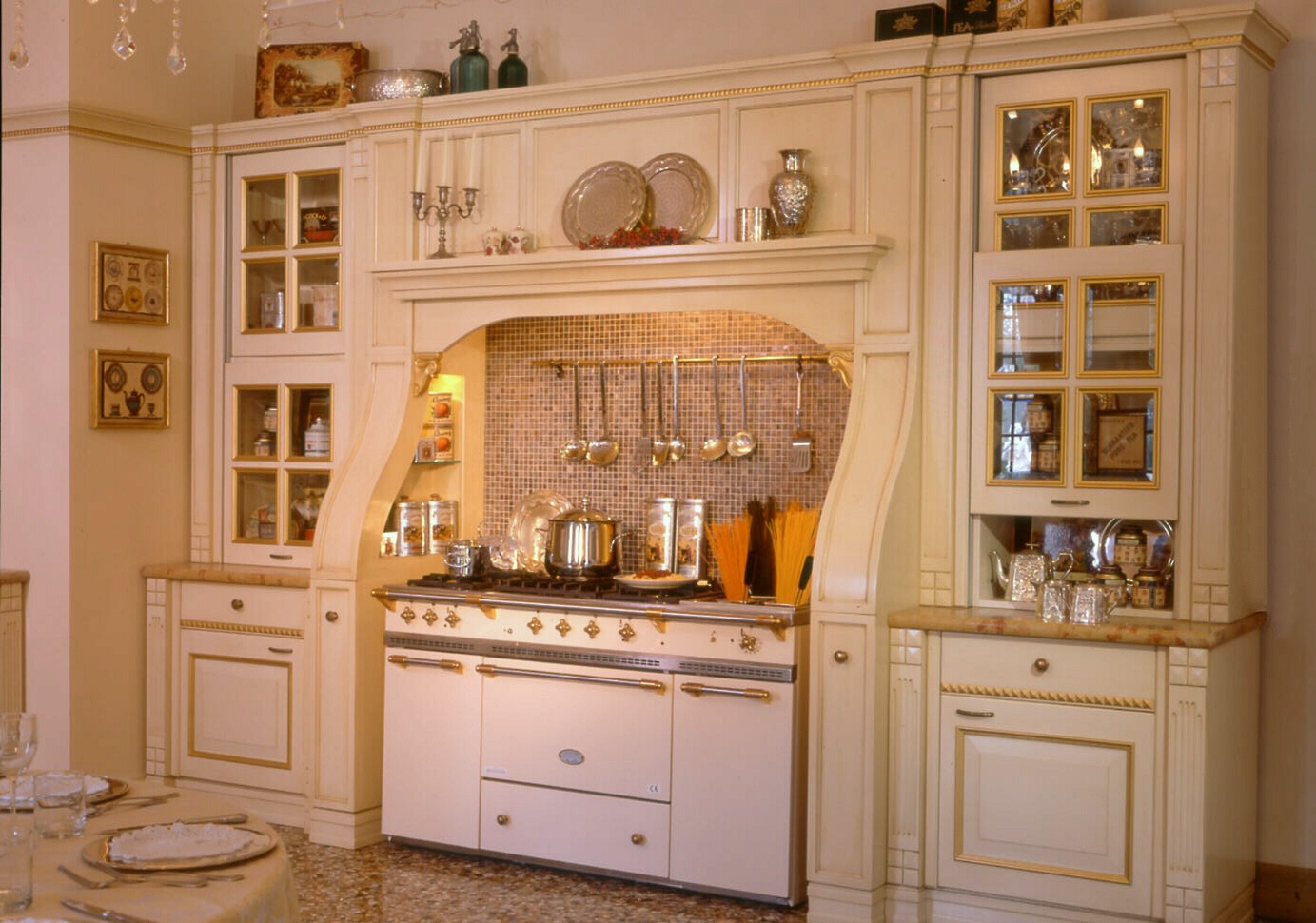Kitchen with island Victoria Victoria collection from the Italian manufacturer Arca. Kitchen set made in a classic style, highlights the best moments and traditions from the history of England. For furniture used walnut wood and other softer woods. Characterized by the revival of ancient forms, combined with rich carving, ornament, and decoration in gold.