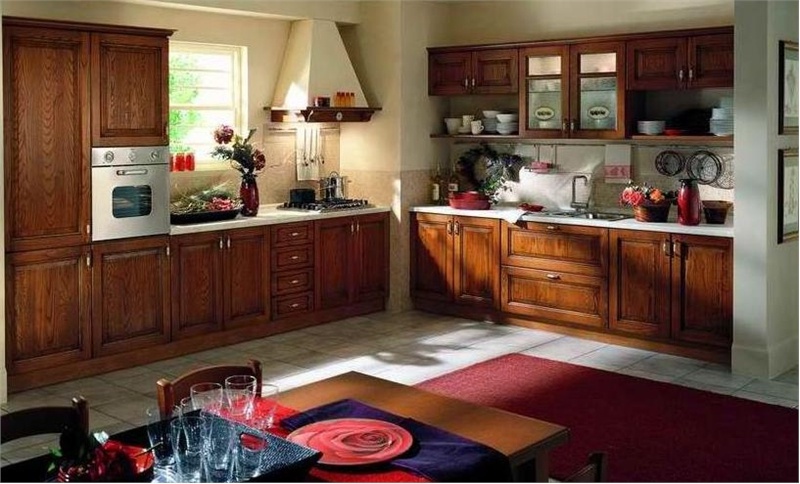 Kitchen Ardesia anticata from the Italian manufacturer Tomassi. Kitchen in a classic style. The frame is made of chipboard of class E1 with a low formaldehyde content, finish options: glossy or matte varnish, veneer artificially aged ash. The working surface upon customer request: stainless steel, stacked array, artificial stone, or laminated chipboard. Colours in stock.