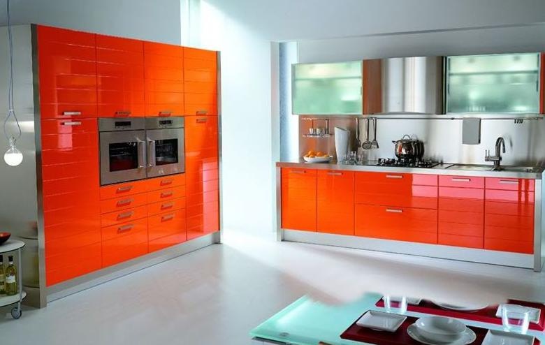 Kitchen Lacche Мodula from the Italian manufacturer Tomassi. Kitchen in a modern style. The frame is made of chipboard of class E1 with a low formaldehyde content. The facades are made in the decoration of plastic and glossy lacquer. The working surface is stainless steel. In the upper panel has a built lighting.