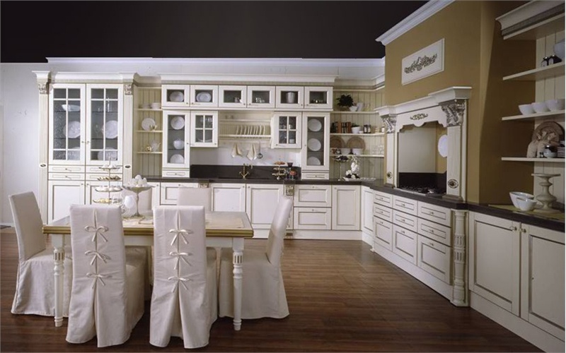 Kitchen set Solaria from the Italian manufacturer Tomassi. Kitchen in a classic style. The frame is made from solid wood. Worktop from artificial stone. Finish options - matte or gloss lacquer, the wood veneer. Feature headset - carved decor. Colours in stock.