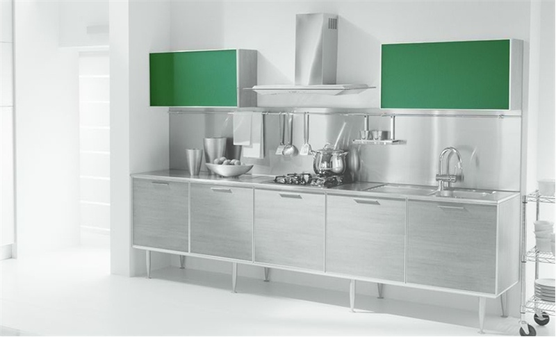 Telai Jolly kitchen furniture from the Italian manufacturer Tomassi. Kitchen in a modern style. Frame of water-resistant particleboard of class E1. Work surface stainless steel laminated chipboard. Finish options - matte or glossy lacquer, melamine foil, colored frosted glass. Colours in stock.