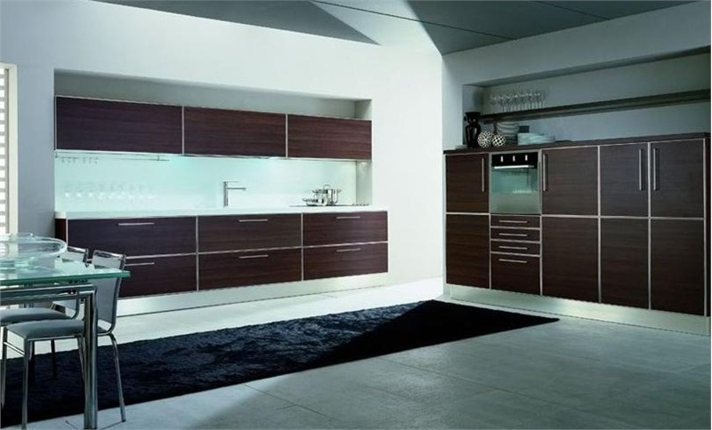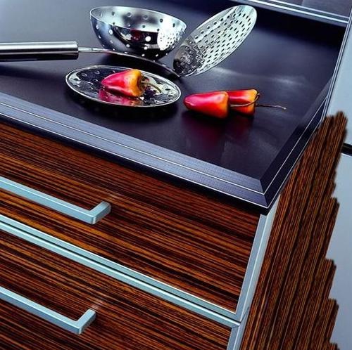 Kitchen Telai Teknica from the Italian manufacturer Tomassi. Kitchen in a modern style. The frame is made of chipboard of class E1 with a low formaldehyde content. Facades are blank, made of the finishing of veneer wenge. Work surface - stainless steel, artificial stone, laminated chipboard. The model is made individually, under the exact dimensions of the customer premises.