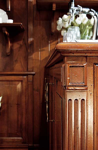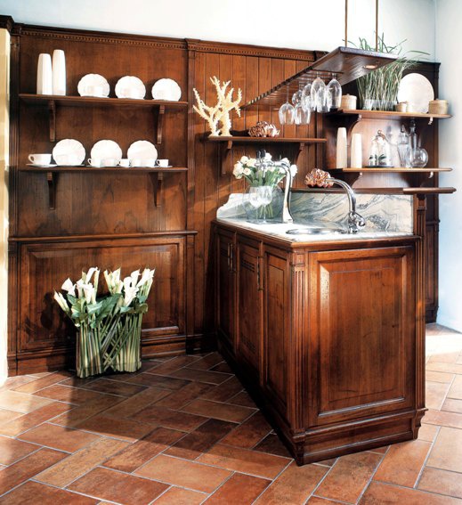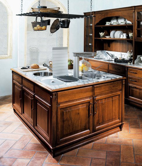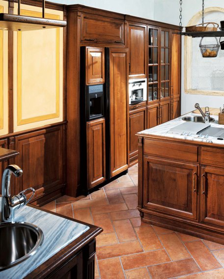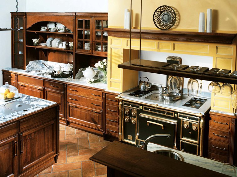 Grand Gourmet kitchen from Italian manufacturer Brummel, collection Gran Gourmet. Kitchen in a classic style. The frame is made from solid wood in the finishing varnish. The facades is deaf or glazed, transparent or smoked glass. Work area - marble white.