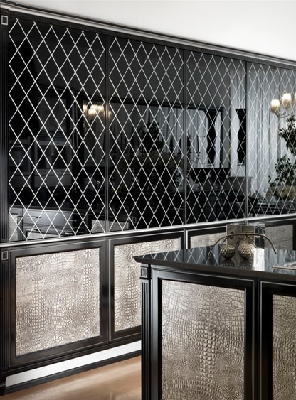 frame: solid wood the facade: glass the facade: crocodile leather working area: natural stone working area : stainless steel handles: metal the facade: lacquered |