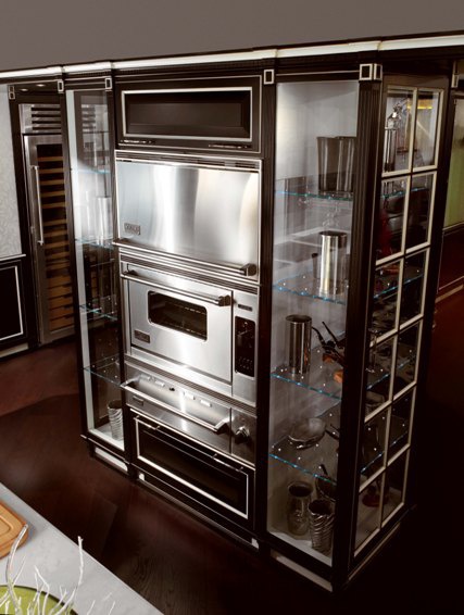 Gran Gourmet kitchen by Italian manufacturer Brummel, collection Gran Gourmet. Kitchen in a modern style. The frame is made from solid wood in the finishing varnish in black color. The facades is deaf and glazed, in the finishing of leather. The handle is made of metal. Working area made of natural stone.