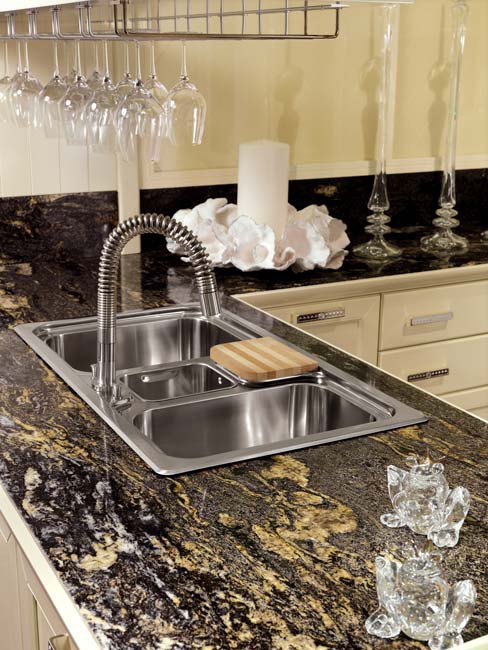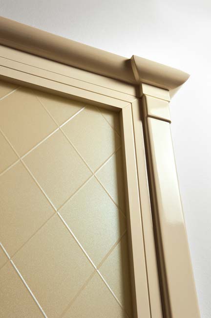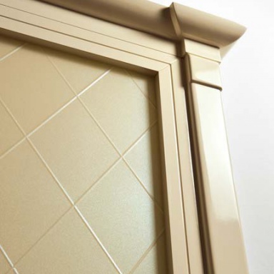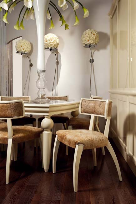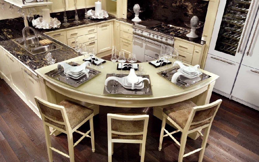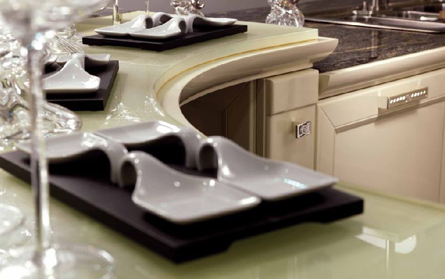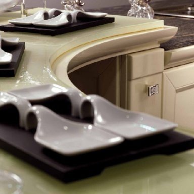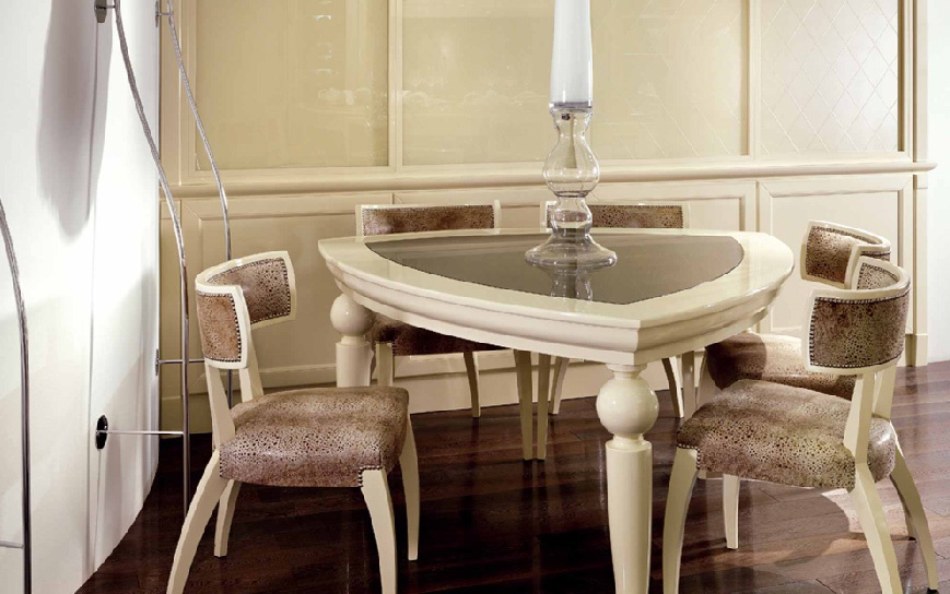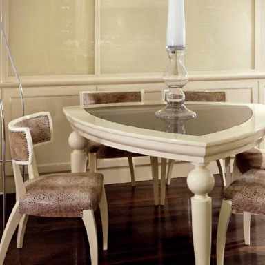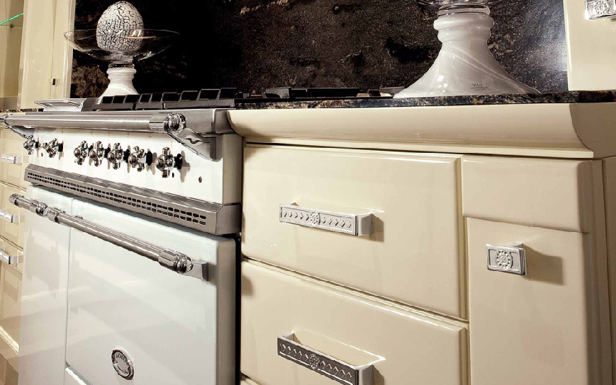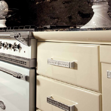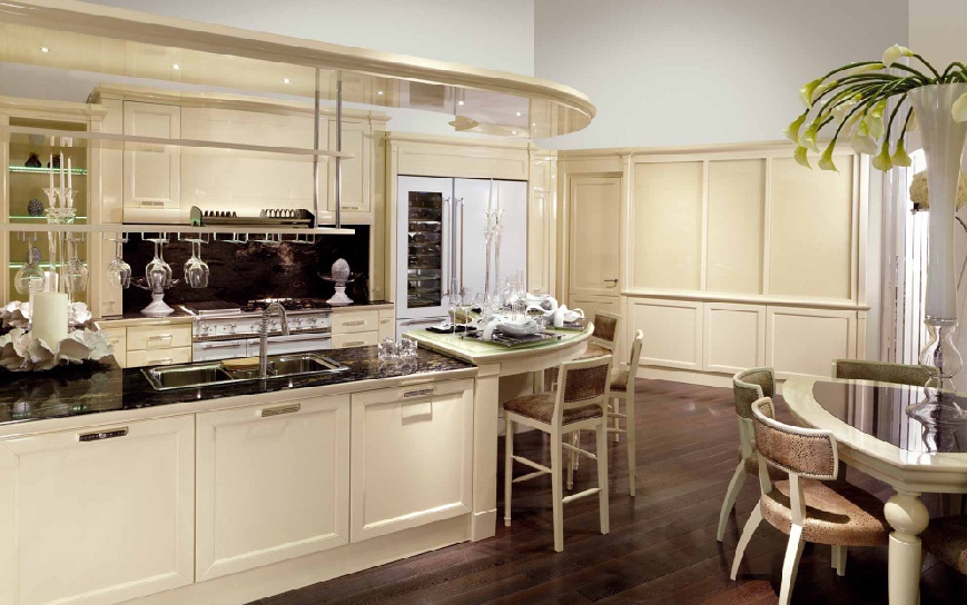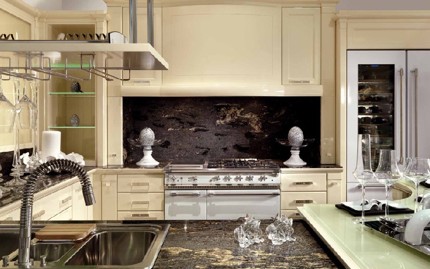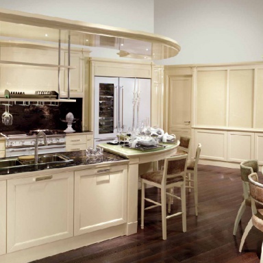 Kitchen Jaipur from the Italian manufacturer Brummel, the Jaipur collection. The kitchen is in art Deco style. The frame is made from solid wood lacquered ivory. The facades is deaf and glazed. The handle is made of metal. The work surface of black marble.