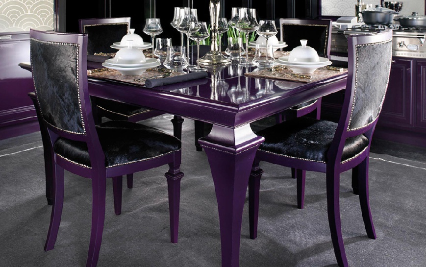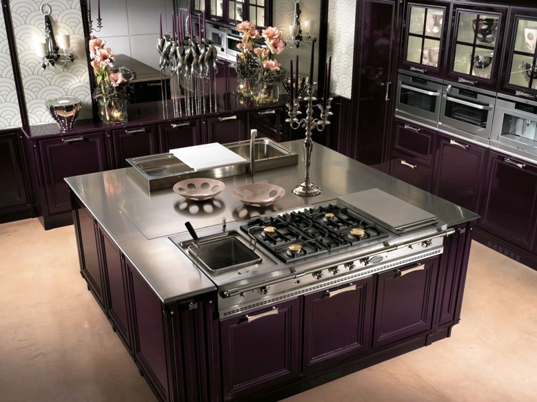 Luxury kitchen furniture from the Italian manufacturer Brummel, Luxury collection. Kitchen in a modern style. The frame is made from solid wood. Finish options: glossy varnish purple. Facades are blank and glazed, there is an internal backlight modules. The working area is stainless steel.