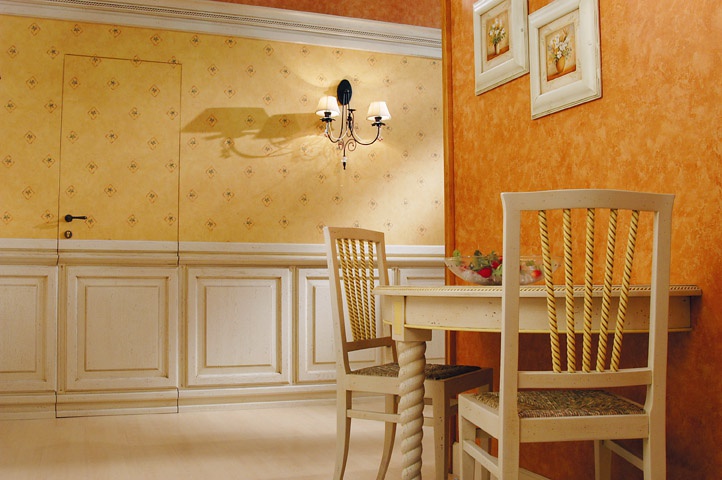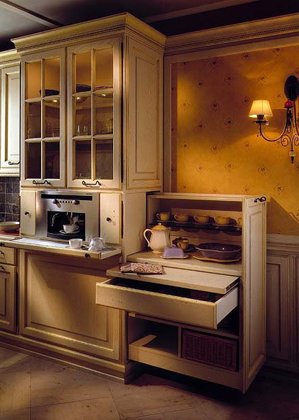 Kitchen Maison Classique from the Italian manufacturer Brummel, collection Maison Classique. Kitchen in a classic style. The frame is made from solid wood, lacquer finish white or cream color. Facades are blank and open, has an internal backlight modules. Work area - an artificial stone.